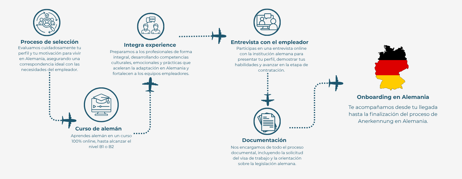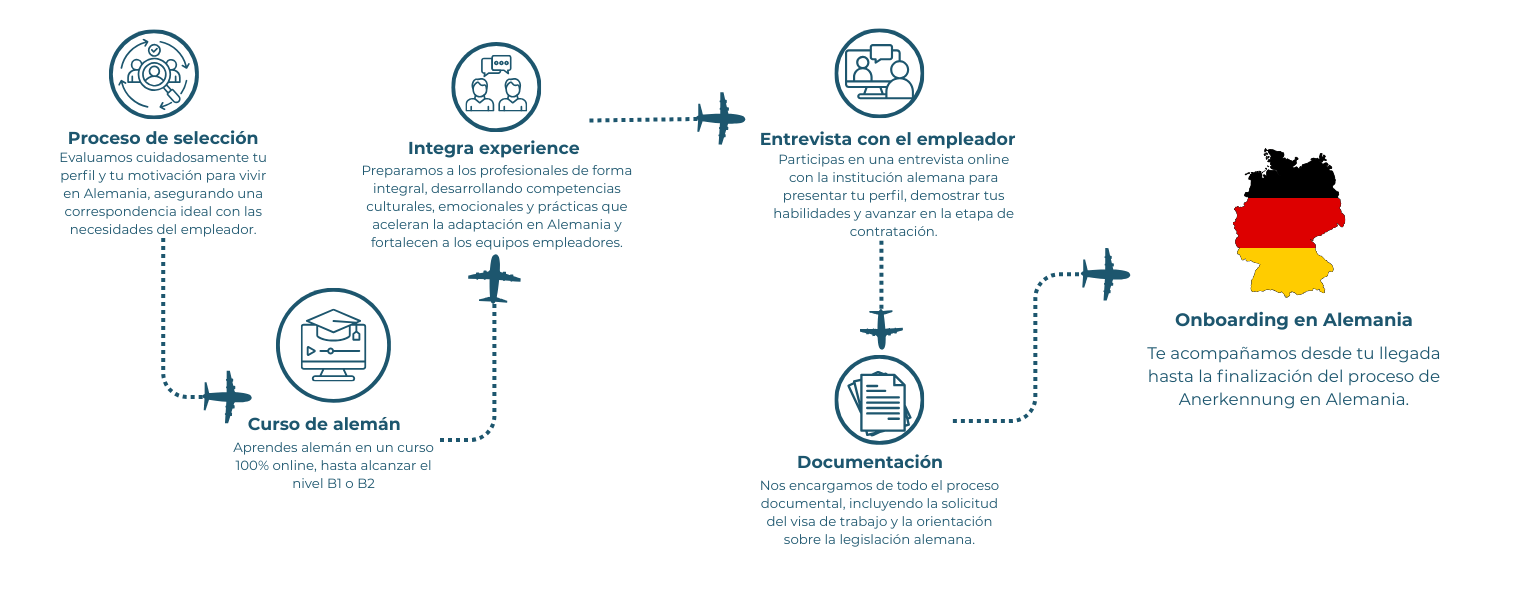 Nuestro diferencial está en el acompañamiento continuo y en el apoyo emocional, que fortalecen las relaciones interpersonales y ayudan a los profesionales a adaptarse a su nueva vida en Alemania.